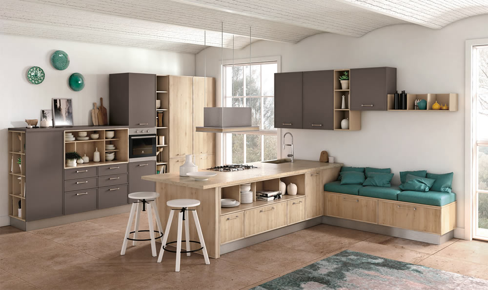 Characterized by limitless modularity, the Rewind model has several elements that make it special and unique, such as the new designer handles created ad hoc with a square form and exclusive hand-finished decoration. Traditional or aluminium open elements for a more modern style, side panels 76 mm thick with a strong design and aluminium frames made to give a continuous frame to the closed wall units are just a few of the distinctive details of this kitchen, designed for comfort and practicality. All the doors are 22 mm thick and are available in new woods: clay ash, pale pink pine, polar pine, natural beech, pinstriped oak and walnut, trendy and unusual colors for the lacquers too, as well as the classic Creo Kitchens colors. The great choice of finishes and colors ensures a high level of customization and configurations to suit any requirement. With Rewind everyone can find their own world: domestic hearth, sensory experience, formal entertaining space or open space for sharing.